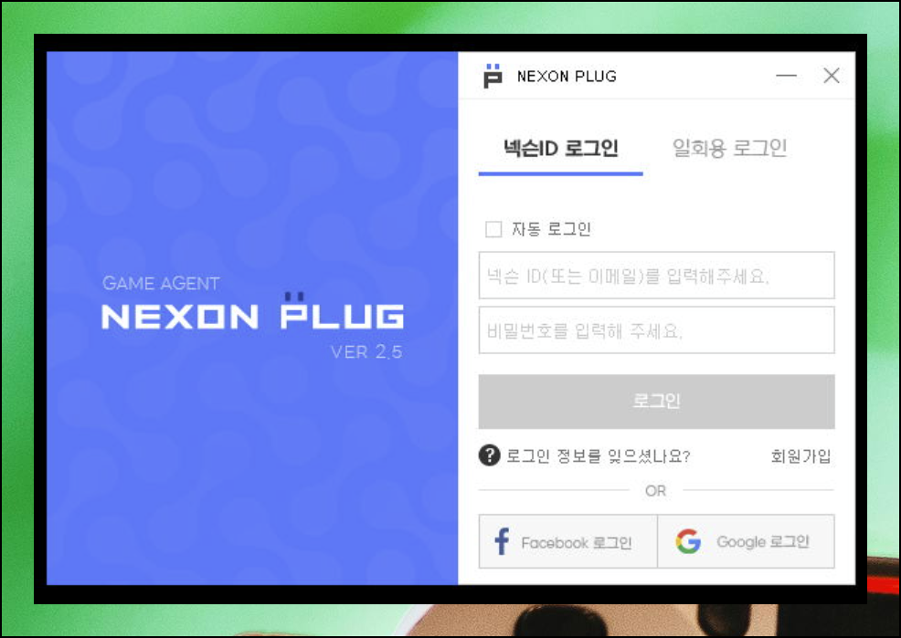 설치를 마친 넥슨플러그를 처음 실행해봤어요. 넥슨ID를 사용하거나 일회용 로그인 방식을 선택할 수 있어요. 별도 계정이 없으신 분들은 페이스북이나 구글 계정을 통해서도 접속이 가능하니 활용해보세요. 다양한 소셜 로그인 옵션이 준비되어 있어서 편리해요.