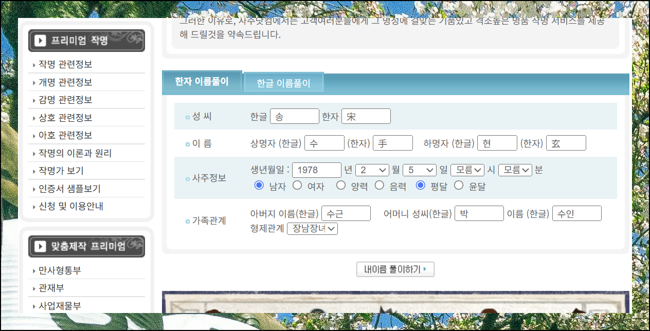 사주닷컴에서는 한자 이름은 물론이고, 한글로 된 이름까지 종합적으로 분석해드려요. 화면 상단부터 차례대로 필요한 정보를 입력해주시면 됩니다. 먼저 분석하고 싶은 성명을 정확히 입력하고요. 생년월일과 성별을 선택해야 해요. 부모님과의 궁합도 분석하기 때문에 아버지와 어머니의 성함을 모두 기입해야 합니다.