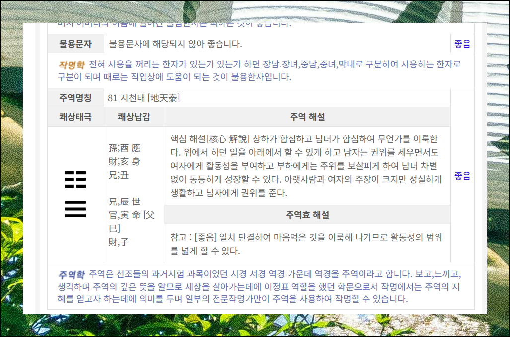 성명에 사용하면 좋지 않은 한자들이 몇 가지 존재해요. 하지만 이런 금기 문자들을 일일이 외우고 다닐 필요는 전혀 없어요. 사주닷컴의 뜻풀이 서비스를 이용하면 불용문자에 해당하는지 자동으로 확인해주거든요. 추가로 주역학을 바탕으로 한 해석 결과도 제공됩니다.