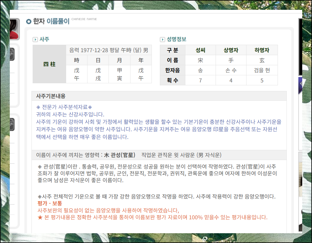 제가 직접 입력해본 한자 성명에는 "신강사주"가 포함되어 있다는 결과가 나왔어요. 이런 경우에는 사주의 기운이 강해 사회 및 가정에서 활력있는 생활을 할 수 있다고 해요. 분석 내용이 상당히 길기 때문에 평가 점수 부분만 확인해도 충분해요.