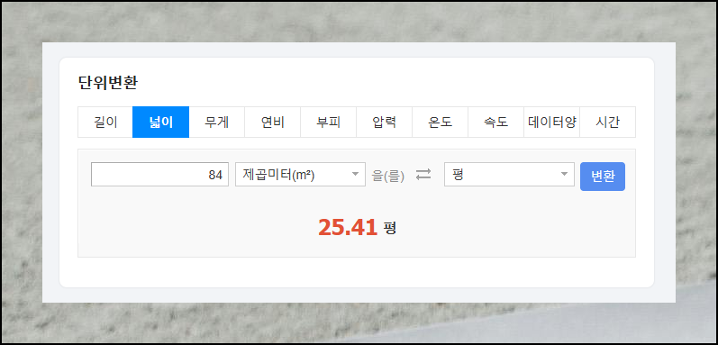 반대 방향으로도 계산해봤습니다. 84제곱미터를 평으로 환산하니 25.41평이라는 결과가 나왔어요. 이처럼 양방향 변환이 모두 가능해서 더욱 편리합니다.