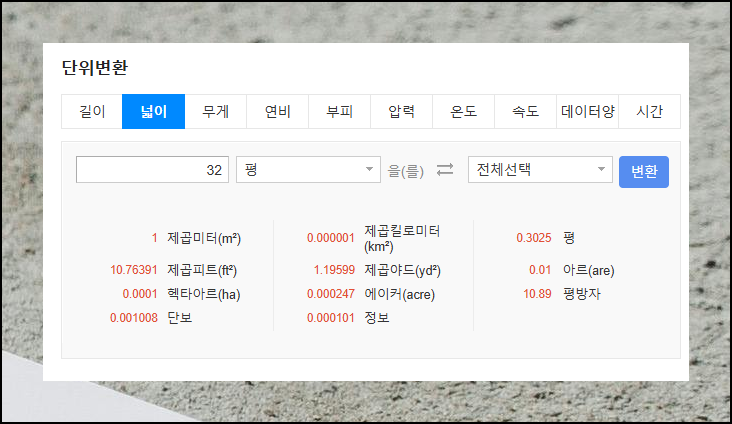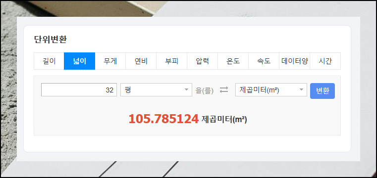 일상생활에서 자주 접하는 아파트 평수를 계산해봤습니다. 32평 아파트를 제곱미터로 변환하면 105.78124제곱미터가 나왔어요. 입력창에 숫자를 넣고 변환 버튼을 누르는 것만으로 이런 정확한 결과를 얻을 수 있습니다.