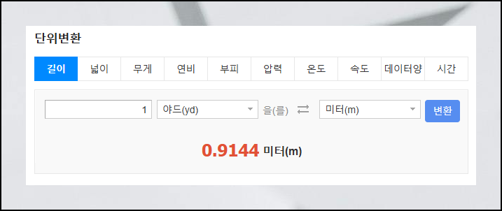 구체적인 예시로 거리를 변환해 보도록 하겠습니다. 1야드가 정확히 몇 미터에 해당하는지 알아보기 위해 야드와 미터를 선택했어요. 계산을 실행한 결과 1야드는 0.9144미터라는 정밀한 값을 확인할 수 있었습니다.