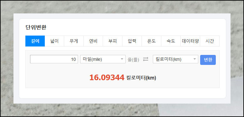 국내에서 잘 사용하지 않는 마일을 테스트해봤어요. 10마일을 km로 환산해본 결과는 16.09344km였습니다. 해외 드라마나 영화에서 마일이 나올 때마다 헷갈렸는데 이제는 쉽게 계산할 수 있겠네요.