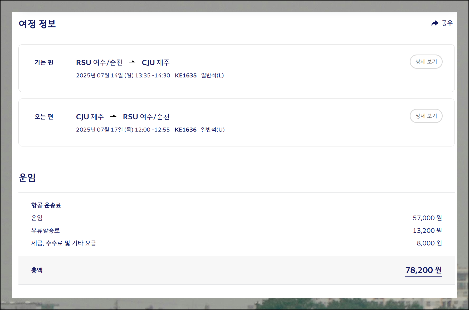 업체 선택까지 마치면 여수 제주도 항공권 예약 페이지로 자동 이동해요. 이곳에서 항공요금, 제세공과금, 발권수수료, 유류할증료 등을 세심하게 확인해주세요. 이용 날짜와 시간도 한 번 더 점검한 다음 화면 안내에 따라 예약 절차를 완료하면 됩니다.