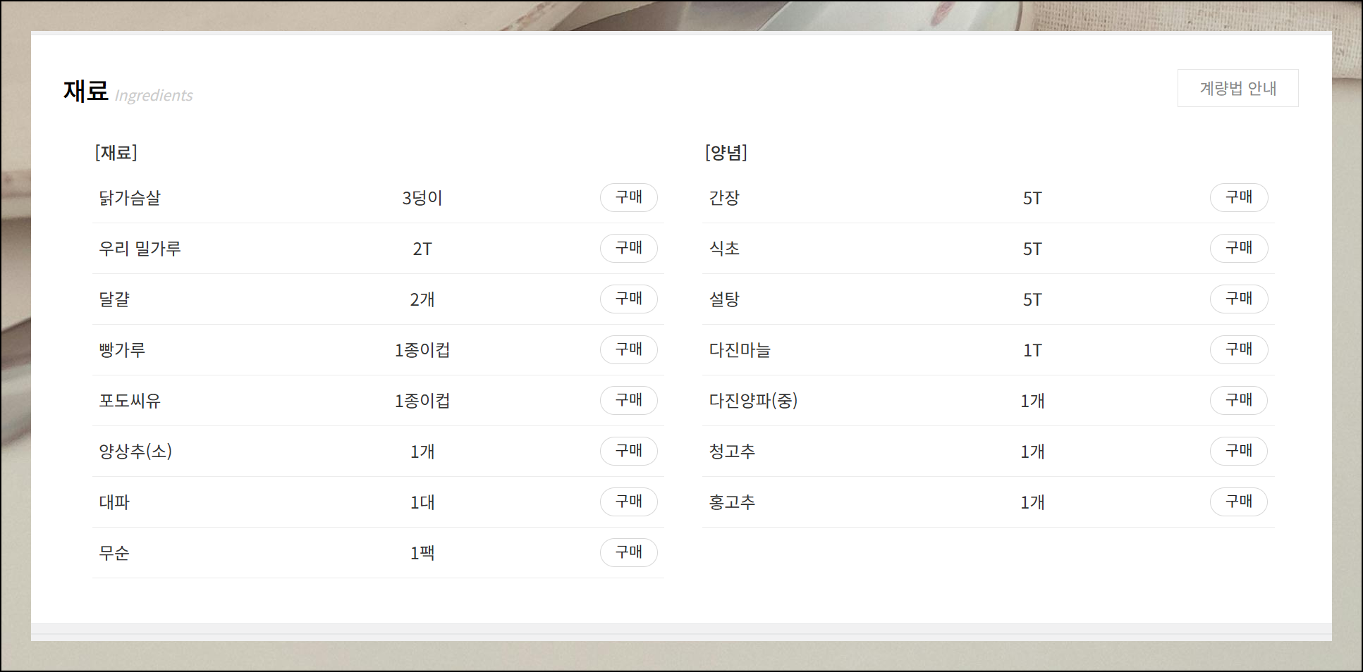 음식에 필요한 재료와 양념 정보도 꼼꼼히 정리되어 있어요. 4인분 기준으로 닭가슴살 3덩이, 밀가루 2큰술, 달걀 2개, 빵가루 1종이컵 등이 들어간다고 나와 있네요.