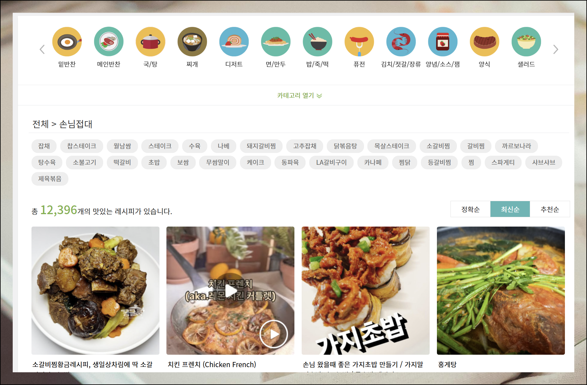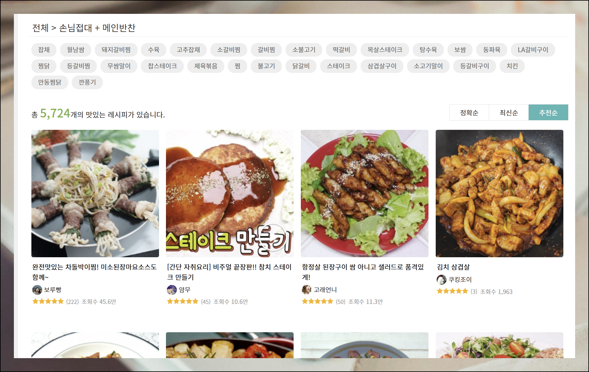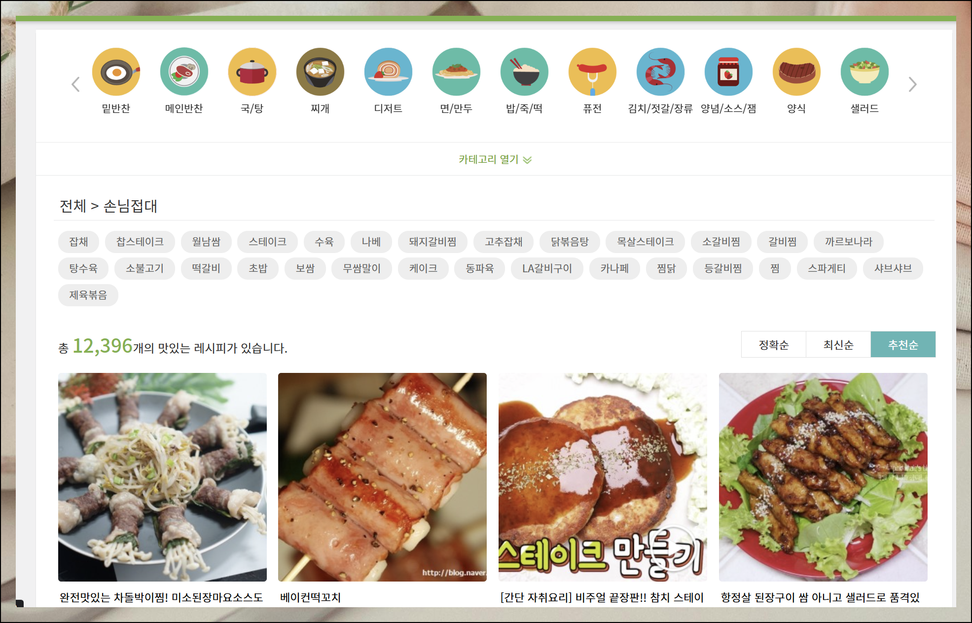 손님 접대용 레시피가 무려 12,396개나 등록되어 있네요. 우측 상단의 추천순 버튼을 눌러보세요. 그러면 많은 사람들이 선호하는 초대요리가 무엇인지 한눈에 알 수 있습니다.