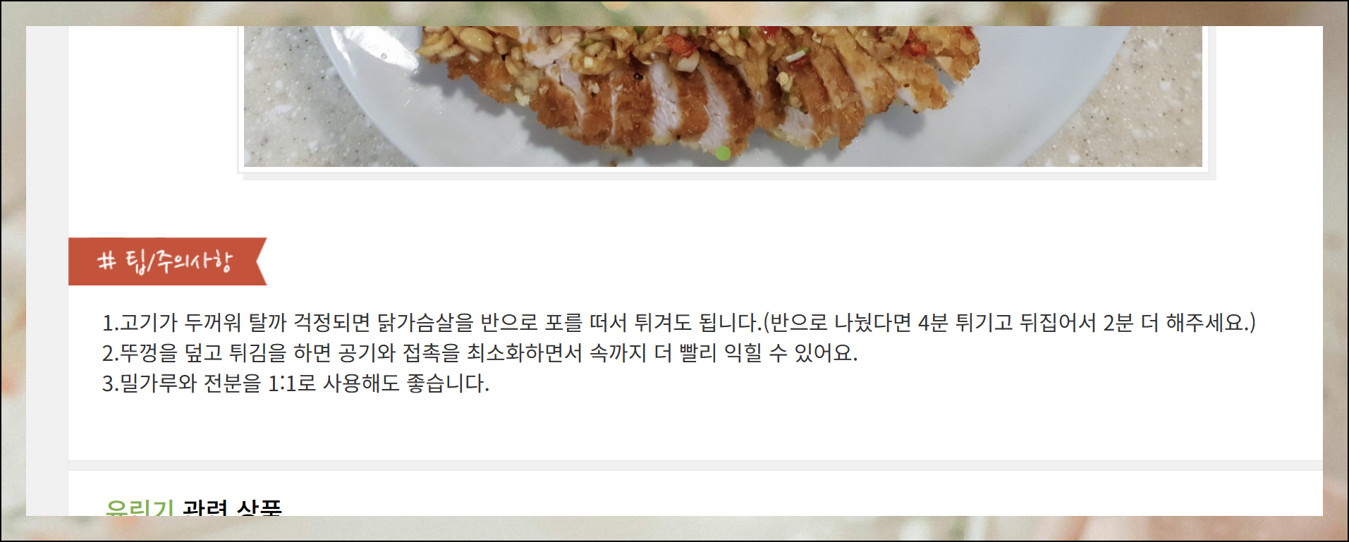 각 레시피에는 유용한 팁과 주의사항들이 함께 제공되어 있어요. 닭가슴살을 튀길 때 타는 것이 걱정된다면 포를 떠서 튀기는 방법도 있다고 하네요.