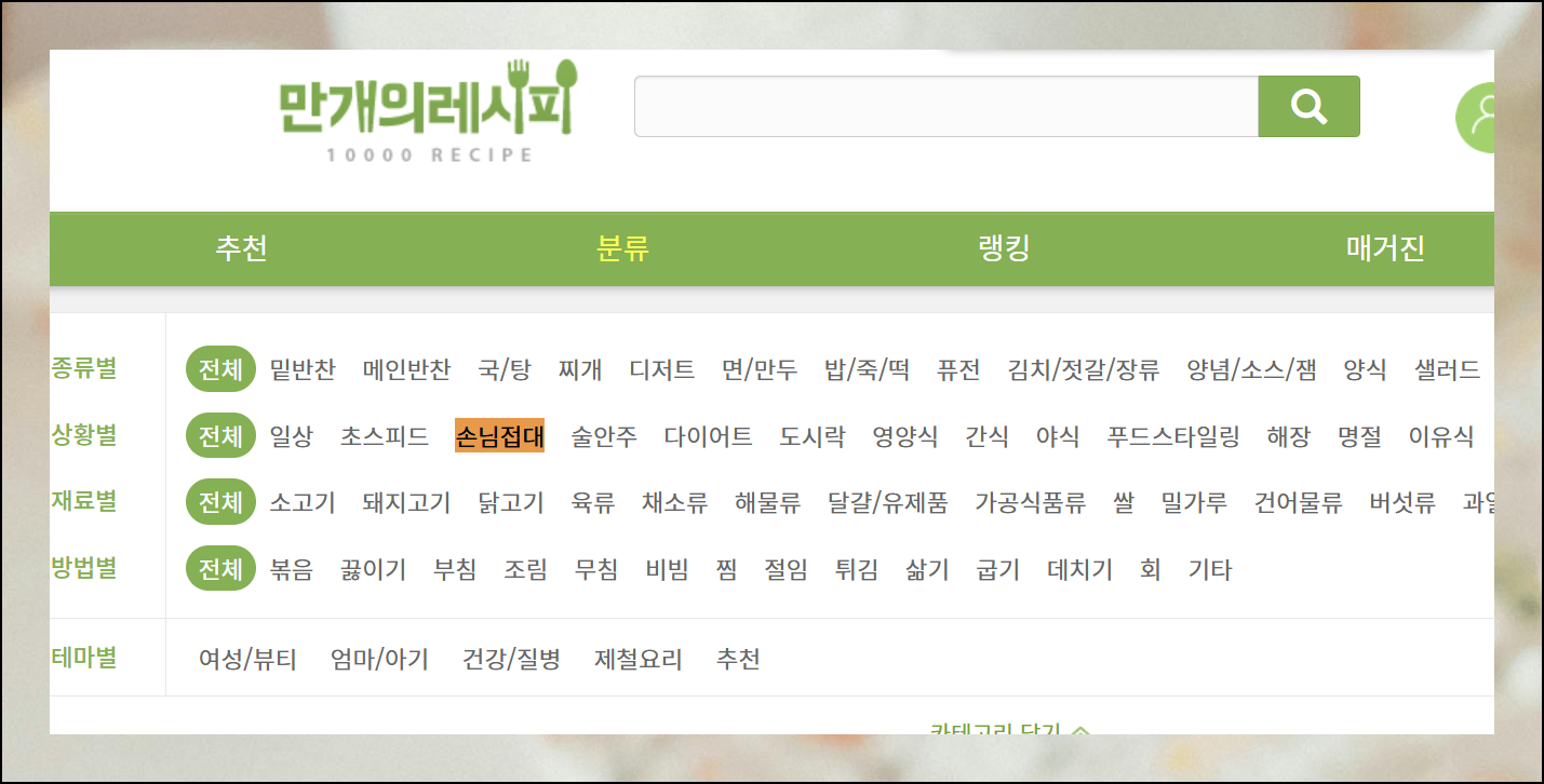 사이트에 들어가시면 손님 초대요리 정보를 쉽게 찾을 수 있어요. 메뉴 하단에 있는 [손님접대] 버튼을 클릭하시면 됩니다. 이 버튼을 누르면 접대에 특화된 음식들만 모아서 보실 수 있어요.