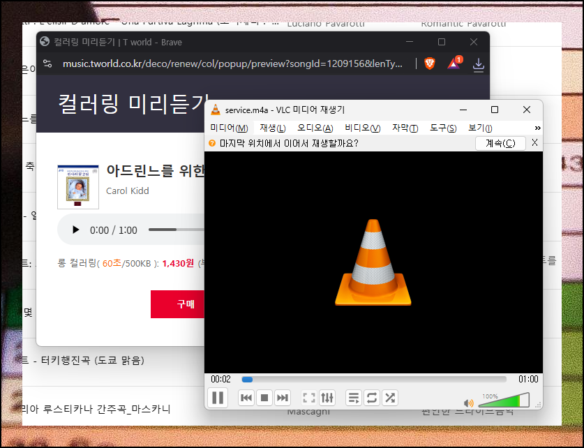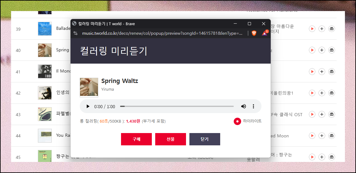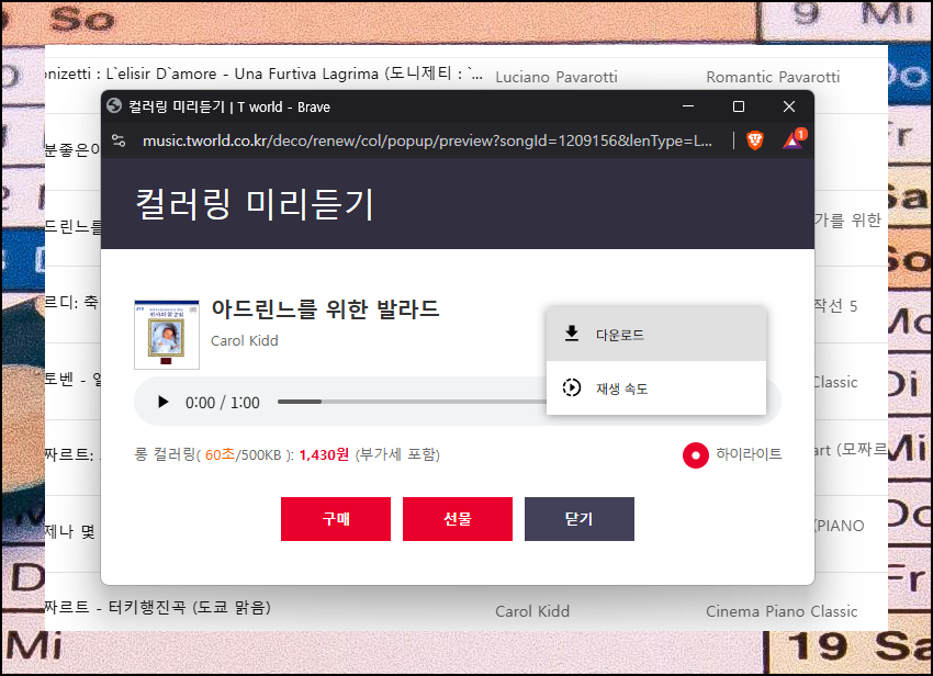 들어보고 싶거나 구매하고 싶은 핸드폰 컬러링 음원을 선택해 보세요. 플레이어 창이 나타나는데요. 여기에서 재생 버튼을 누르면 들어볼 수 있어요. 좀 더 자주 듣고 싶은 경우에는 [다운로드] 버튼을 눌러 컴퓨터에 저장하는 방식을 사용해도 됩니다.