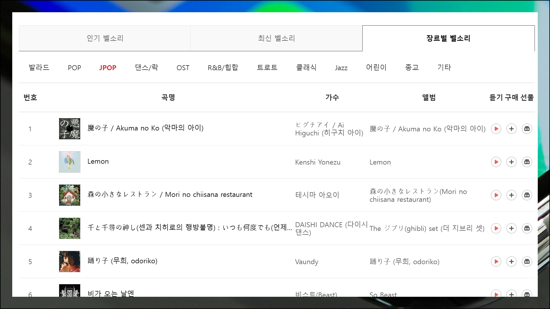 페이지에 들어가면 핸드폰에서 인기 있는 음원 5개가 먼저 화면에 나타나요. 더 많은 선택지를 보고 싶다면 [더보기] 버튼을 눌러주세요. 새로운 페이지가 열리면 음원 검색 기능과 함께 인기 순위표를 확인할 수 있어요. 인기곡 목록과 최신곡 목록을 차례로 살펴보면서 무료로 다운로드 받고 싶은 음원이 있는지 찾아보시면 됩니다.