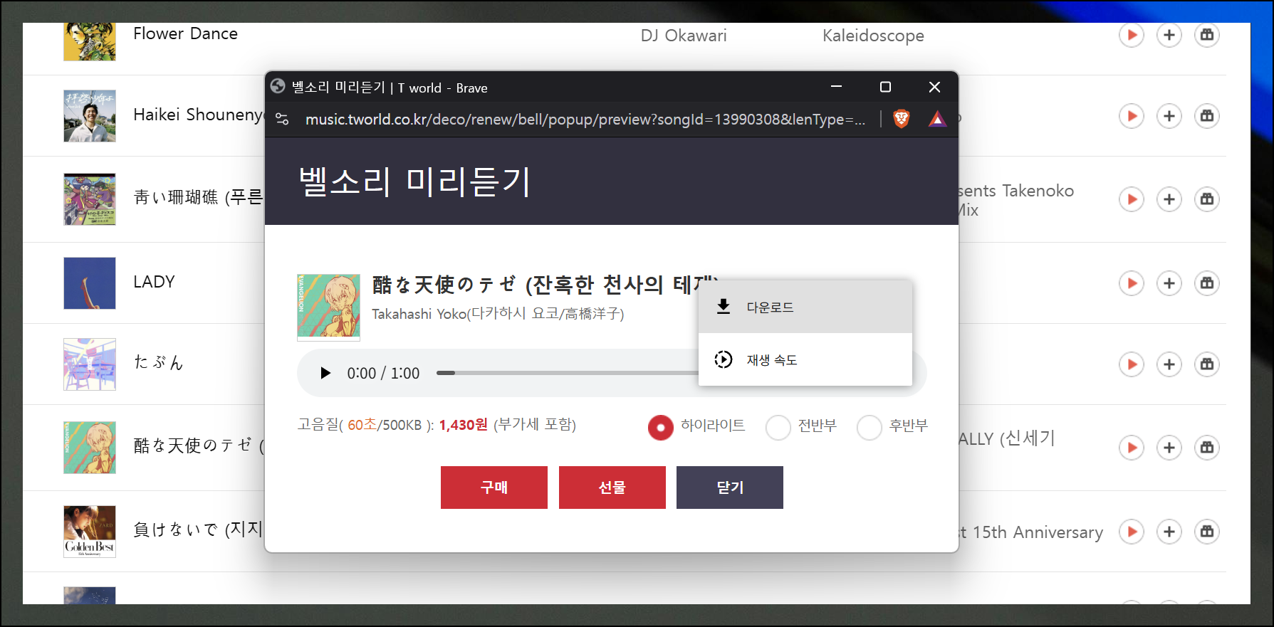 원하는 것이 없다면 장르별로 분류된 메뉴를 활용해보는 것도 좋은 방법이에요. 다운로드하기 전에 미리 들어볼 수 있어서 더욱 편리합니다. 우리가 찾는 음원 다운 받는곳은 미리듣기 창에서 찾을 수 있어요. 오디오 재생 플레이어를 확인해보세요. 플레이어 가장 오른쪽에 있는 메뉴 버튼을 클릭하면 다운로드 버튼이 나타납니다.