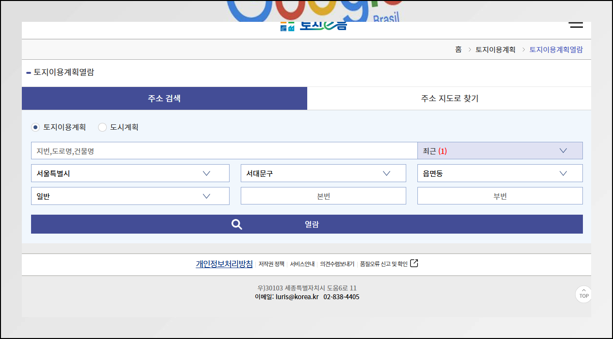 국토교통부에서 운영하는 LURIS 토지이용규제정보서비스도 있어요. 누구나 쉽게 토지이용계획이나 지적도를 무료보기 할 수 있는 사이트입니다. 검색창에 "루리스"라고 입력하면 바로 찾을 수 있어요.