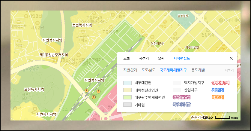 국토계획 및 개발지구 메뉴를 선택하면 지적도를 통해 더 자세한 정보를 볼 수 있습니다. 특정 지역이 택지개발지구인지, 산업지구인지, 광역개발권역인지 색과 선으로 명확하게 구별돼요. 특정지역개발, 기업도시, 혁신도시 등의 정보도 함께 확인할 수 있어서 유용합니다.
