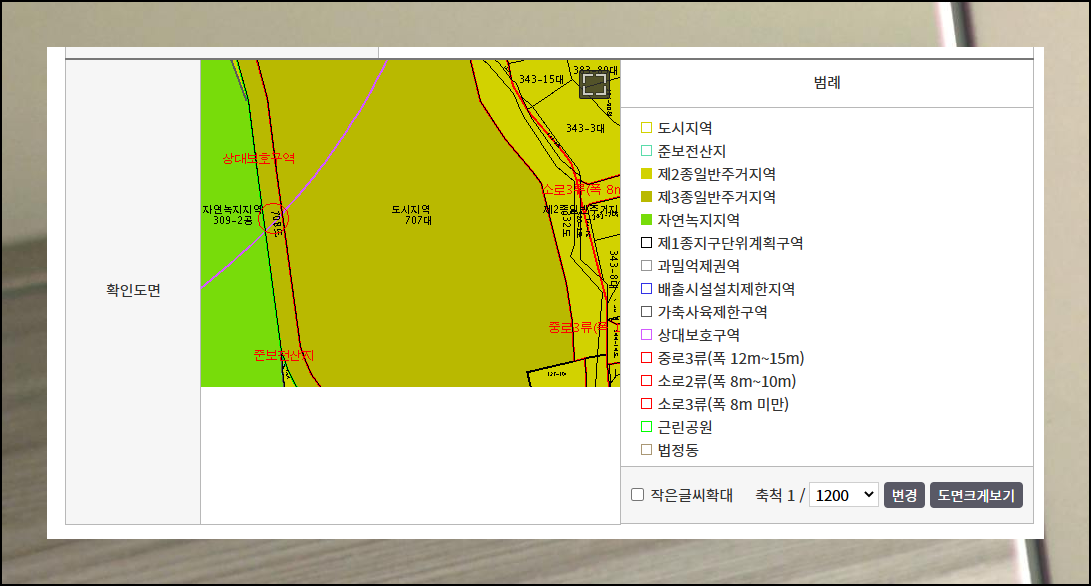 검색 결과 화면을 아래로 내리면 지적도가 나타나요. 해당 지역이 어떤 구역으로 분류되어 있는지 한눈에 파악할 수 있습니다. 범례를 참고해서 보기를 하시면 토지정보 해석이 훨씬 쉬워집니다.