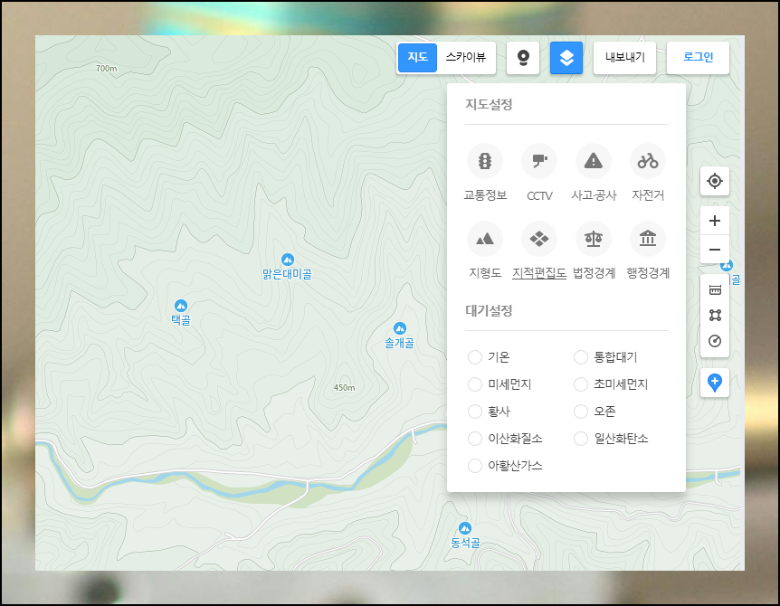 카카오맵 사이트에 접속하면 일반 지도 화면이 먼저 나타납니다. 우측 상단에 두 개의 사각형이 겹쳐진 아이콘을 찾아보세요. 이 아이콘을 클릭하면 지도와 대기 설정 창이 열리는데요. 여기서 지적편집도를 선택하면 바로 무료 토지정보 확인이 가능해요.