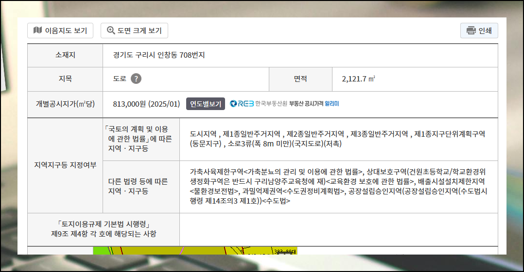 토지이용계획 열람 버튼을 클릭하면 해당 토지의 다양한 정보를 확인할 수 있어요. 면적, 개별 공시지가, 지목, 소재지, 지역지구등 지정여부 등 필요한 정보들이 모두 제공됩니다.