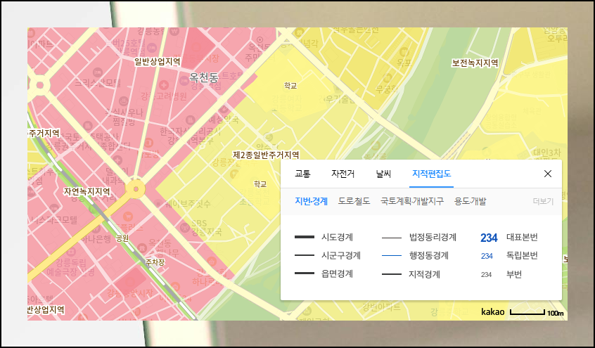지적도로 화면이 바뀌면서 각 지역별로 색깔이 다르게 표시됩니다. 일반주거지역, 준공업지역, 자연녹지지역 등으로 구분되어 나타나요. 우측 하단 메뉴를 통해 지번과 경계, 국토계획 및 개발지구 정보를 추가로 표시할 수 있어요.