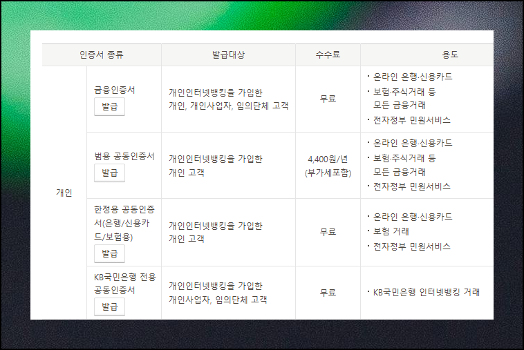 개인 대상 공인인증서는 범용형과 은행 전용으로 나누어져요. 은행 전용은 비용 부담 없이 제공되며 기본적인 전자거래를 모두 지원합니다. 범용형은 발급방법이 동일하지만, 연간 4400원의 이용료가 생겨요. 여러 가지 모든 전자거래 서비스 이용할 수 있다는 장점이 있습니다.