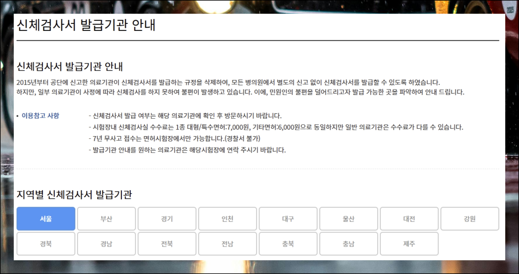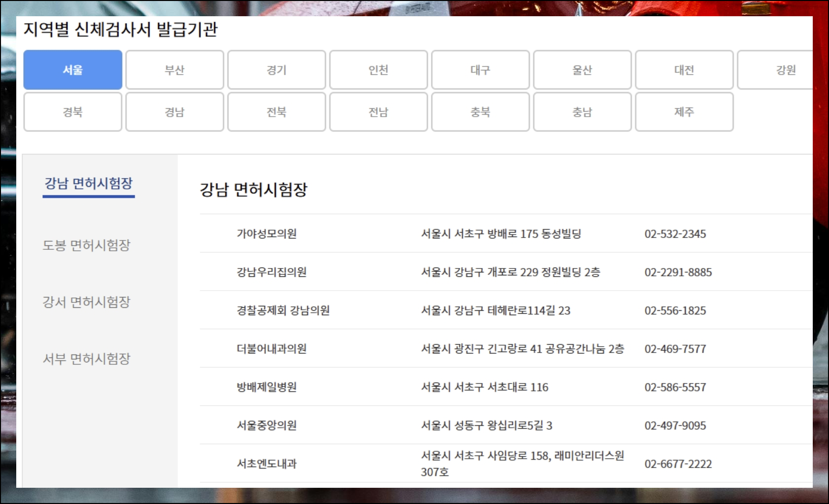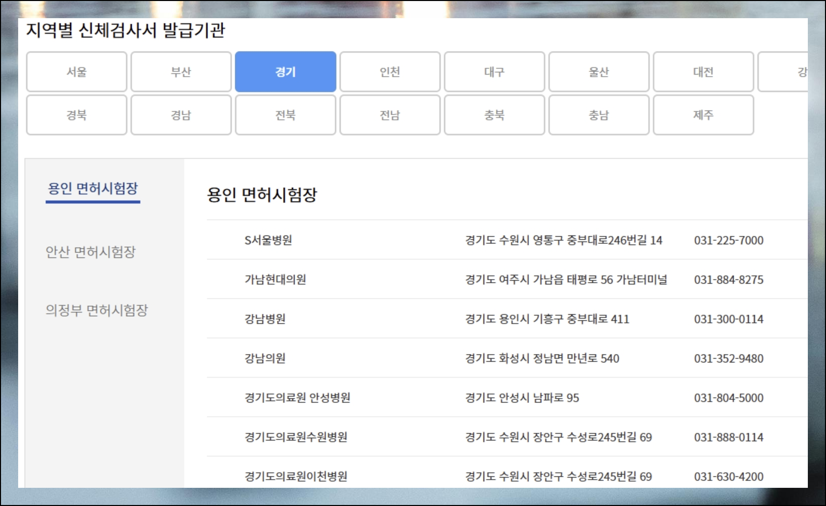운전면허를 처음 받거나 유효기간이 끝나기 전에 꼭 필요한 것이 신체검사서입니다. 면허시험장에서도 가능하지만, 지정병원에서 받는 것이 더 수월할 수 있어요. 적성검사 만료일이 다가오기 전에 미리 준비해놓으면 좋습니다. 우리나라 전체에 검사 가능한 의료기관들이 많이 있어서 주변에서 쉽게 찾을 수 있어요. 서울이나 경기권뿐만 아니라 인천, 부산 같은 큰 도시들에도 지정된 곳이 많아요. 초보자도 어렵지 않게 이용 가능합니다.