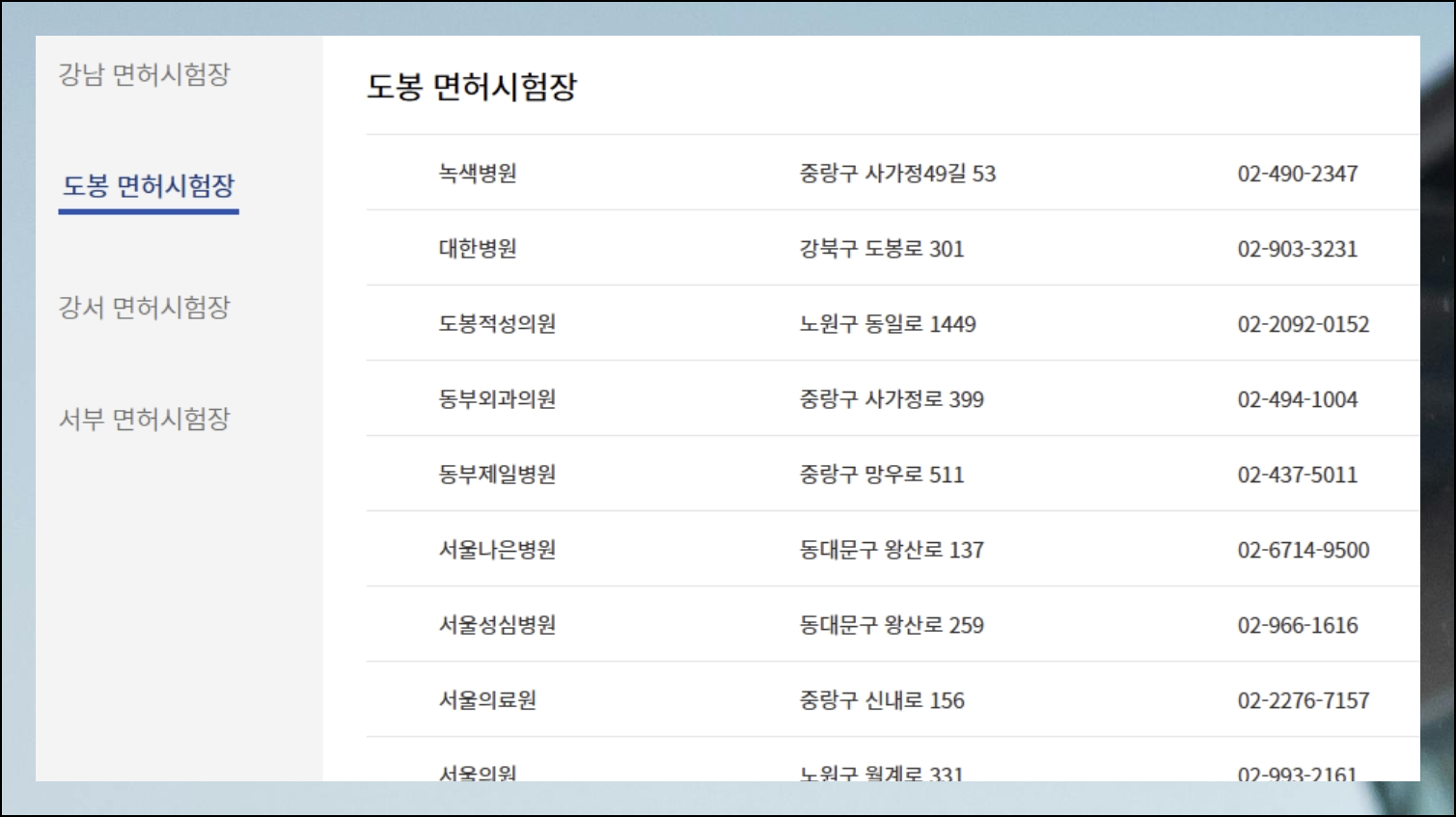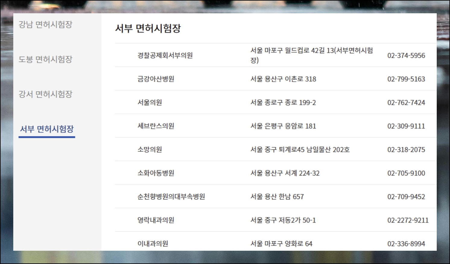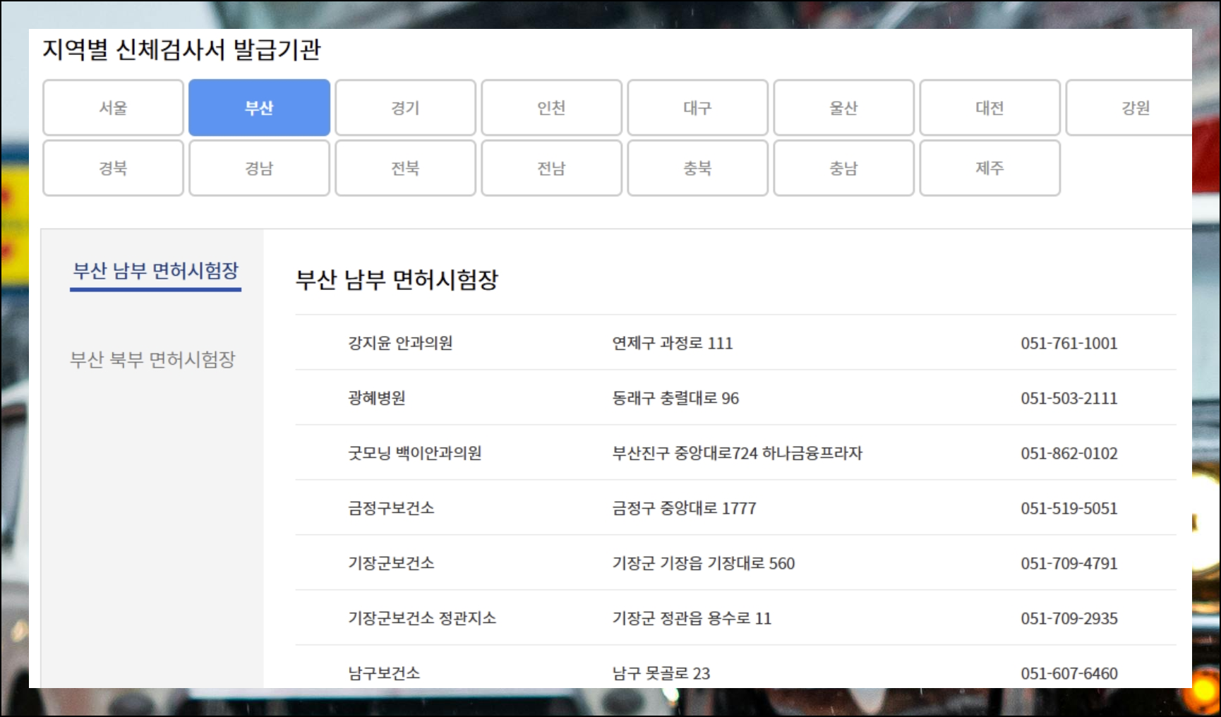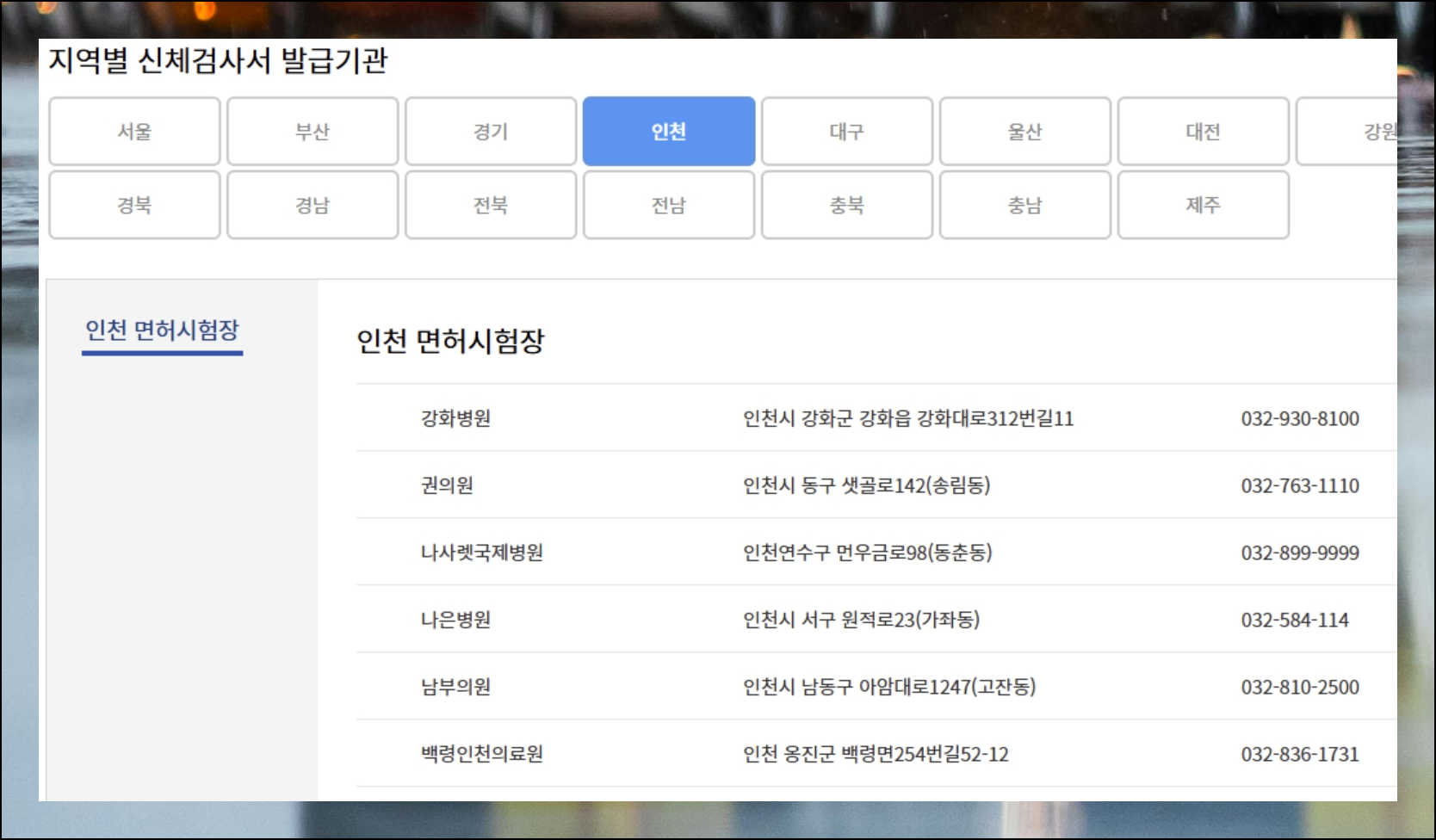운전면허를 처음 받거나 유효기간이 끝나기 전에 꼭 필요한 것이 신체검사서입니다. 면허시험장에서도 가능하지만, 지정병원에서 받는 것이 더 수월할 수 있어요. 적성검사 만료일이 다가오기 전에 미리 준비해놓으면 좋습니다. 우리나라 전체에 검사 가능한 의료기관들이 많이 있어서 주변에서 쉽게 찾을 수 있어요. 서울이나 경기권뿐만 아니라 인천, 부산 같은 큰 도시들에도 지정된 곳이 많아요. 초보자도 어렵지 않게 이용 가능합니다.