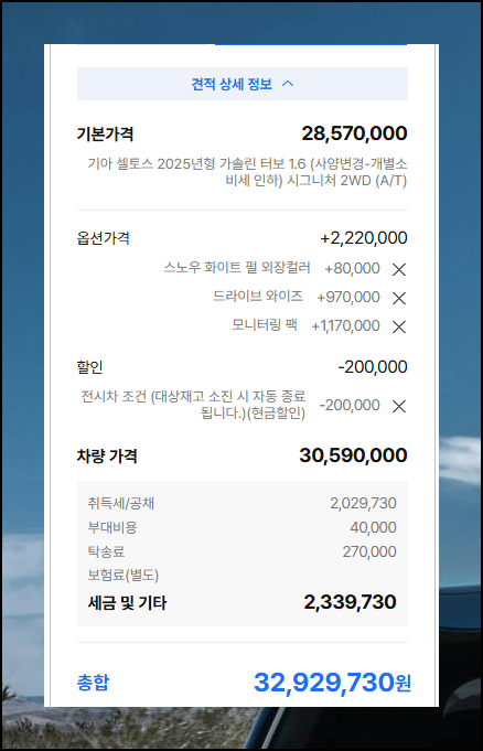 무료 회원가입 없이도 바로 이용 가능하며, 각종 세금과 부대비용까지 포함된 신차 가격표 및 총액을 볼 수 있어서 예산 계획 세우기에 정말 유용해요. 기아자동차의 인기 소형 suv에 해당하는 셀토스 구매를 고려 중이시라면 꼭 한 번 확인해보세요.