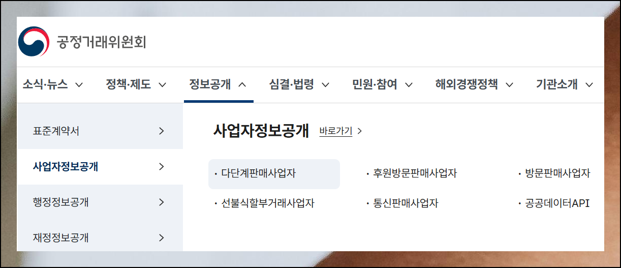 공정거래위원회 홈페이지에 접속한 후 정보공개 메뉴를 선택하면 사업자등록현황을 찾을 수 있어요. 통신판매, 방문판매, 전화권유판매, 다단계판매, 후원방문판매사업자로 구분된 5개 유형의 정보를 조회할 수 있습니다.