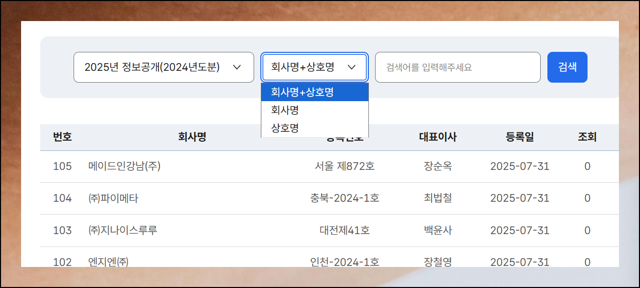 상호등록 조회가 끝나면 메인 화면으로 이동하게 됩니다. 입력창에는 선택한 기업명이 이미 입력되어 있어요. 이 상태에서 검색 버튼을 누르면 더욱 상세한 정보를 살펴볼 수 있습니다.