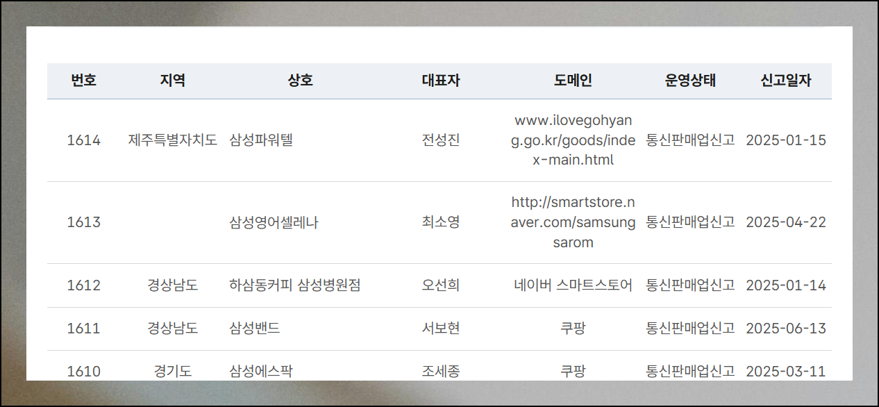 삼성이라는 키워드로 조회해보면 첫 번째 방법보다 많은 업체 목록을 확인할 수 있습니다. 통신판매업으로 신고된 모든 관련 회사들이 표시되기 때문이에요. 리스트에서 원하는 업체를 선택하면 자세한 내용을 볼 수 있어요.