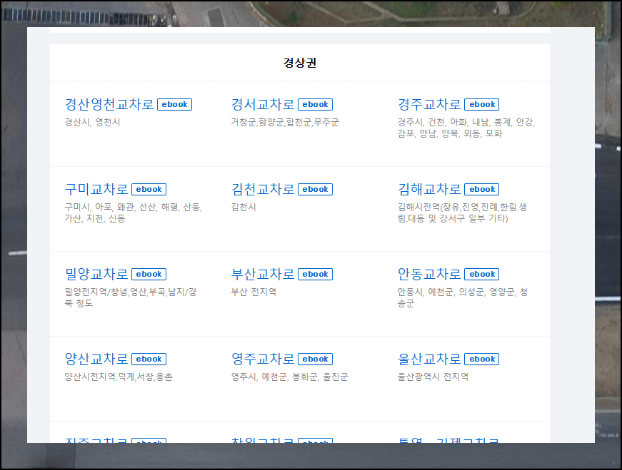 교차로는 전체 지역을 8개 권역으로 분할하여 운영하고 있어요. 서울권을 비롯해 경기권, 강원권, 충청권 등으로 나누어져 있거든요. 대구에 사는 분이라면 경상권을 골라야 할 텐데요. 그런데 여기서 뜻밖의 문제가 나타나요. 경상권 리스트를 살펴봐도 대구라는 이름을 발견할 수 없거든요.