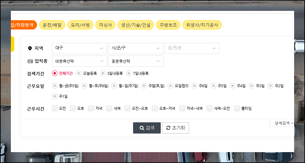 대구교차로 사이트의 탐색 기능이 정말 훌륭합니다. 원하는 위치를 정확하게 지정할 수 있어요. 사업 분야와 직무도 세세하게 분류되어 있고, 출근 요일과 시간까지 필터로 설정할 수 있거든요.