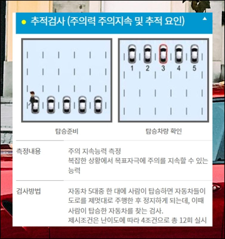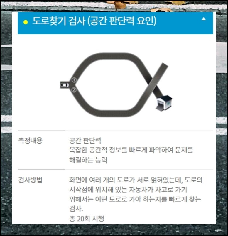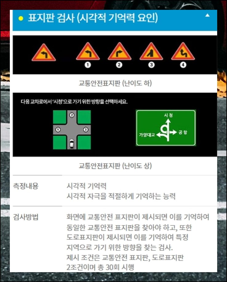 나머지 네 가지 항목도 설명드릴게요. 목적지까지 가는 경로를 정확히 파악하는 역량을 봅니다. 도로 위 각종 표지판 내용을 얼마나 잘 기억하는지도 평가 대상이에요. 승객이 탑승한 차량을 다른 차와 구별해내는 인지 수준도 측정합니다. 여러 상황을 동시에 판단하고 처리하는 복합 기술까지 종합적으로 확인하는 거예요.