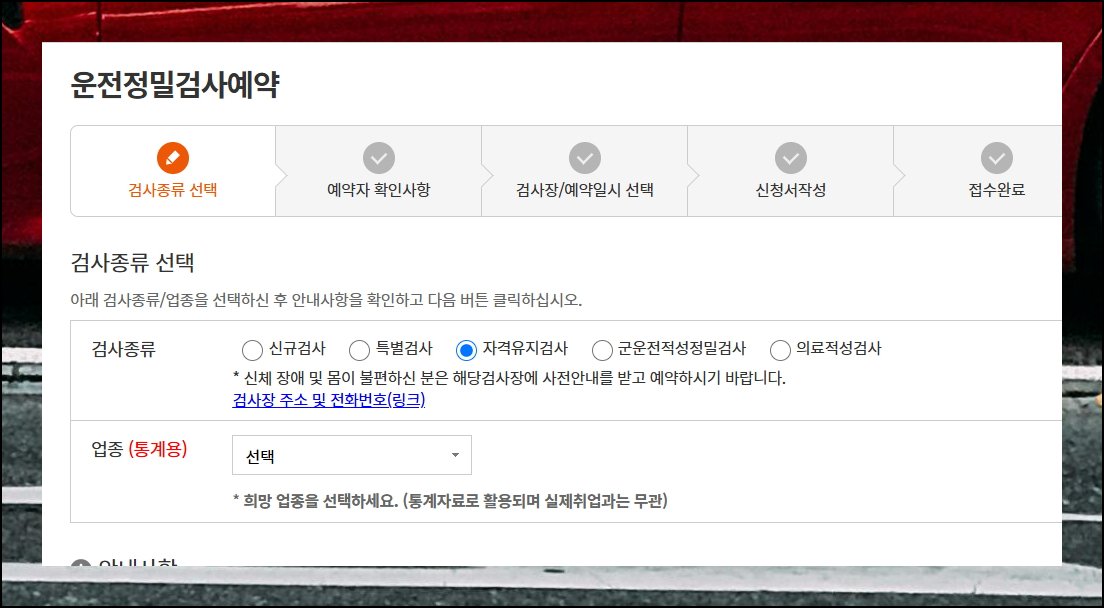 메뉴에서 운전정밀검사예약을 찾아 눌러주세요. 새로운 페이지가 열리면서 종류와 업종을 고르는 화면이 나타납니다. 본인의 상황에 맞는 항목을 골라주시면 돼요. 그다음 과정으로 넘어가면 지역과 기관을 정할 수 있어요. 원하시는 날짜도 달력에서 직접 지정하시면 됩니다. 마지막 과정에서 신청서 양식에 필요한 정보를 입력하시면 모든 절차가 마무리됩니다.