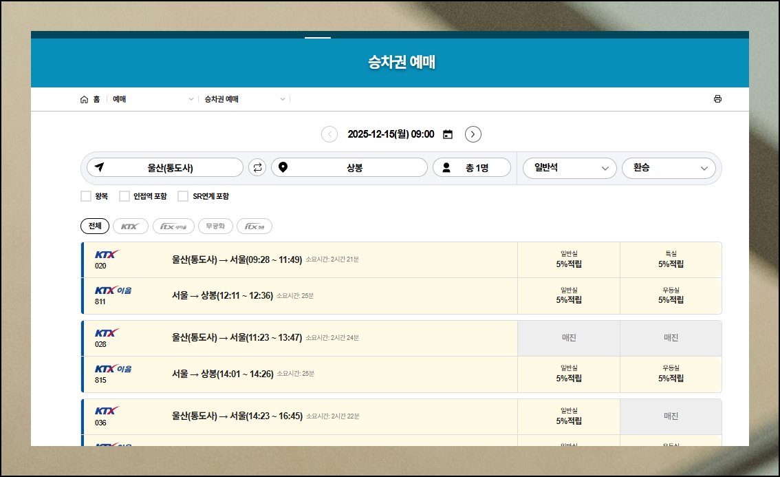 ITX청춘열차 예약 절차는 다른 기차와 크게 다르지 않아요. 예약 화면에서 출발역과 도착역을 청춘 노선 내에서 골라주세요.