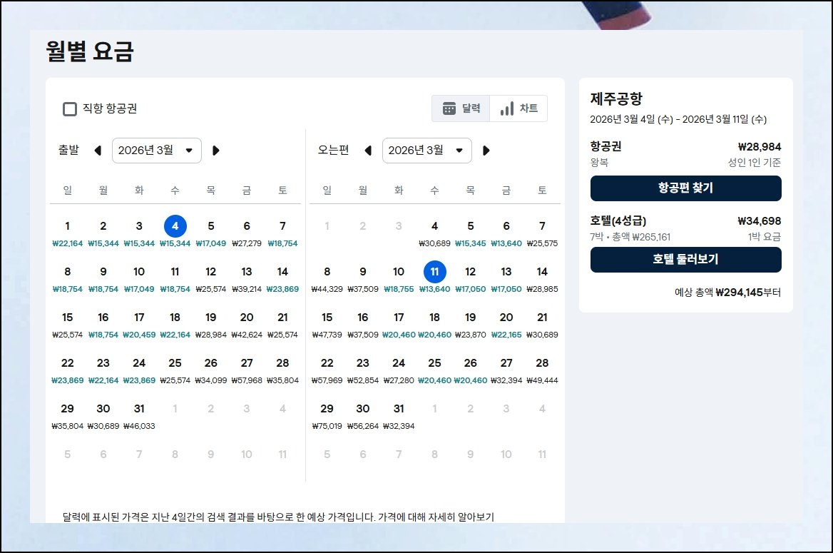지난 달에는 제주 왕복 비행기표가 2만원대까지 내려간 적이 있었습니다. 현재 2월 시점에서도 왕복 2만원대 후반 선의 가격으로 구할 수 있어요. 성수기로 접어들면 순식간에 좌석이 사라지니 빠르게 움직여야 합니다. 하루 단위로 요금 추이를 점검한 뒤 상세 보기를 누르면 스케줄까지 파악 가능해요.