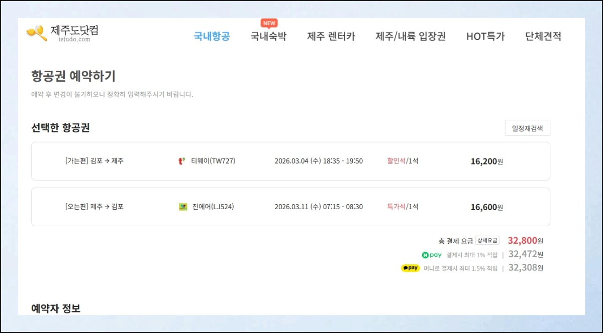예매 페이지에서 제주 항공권 세부 사항을 재차 점검하고 탑승자 정보를 기입하세요. 결제를 마무리하면 좌석 확보가 완료됩니다.