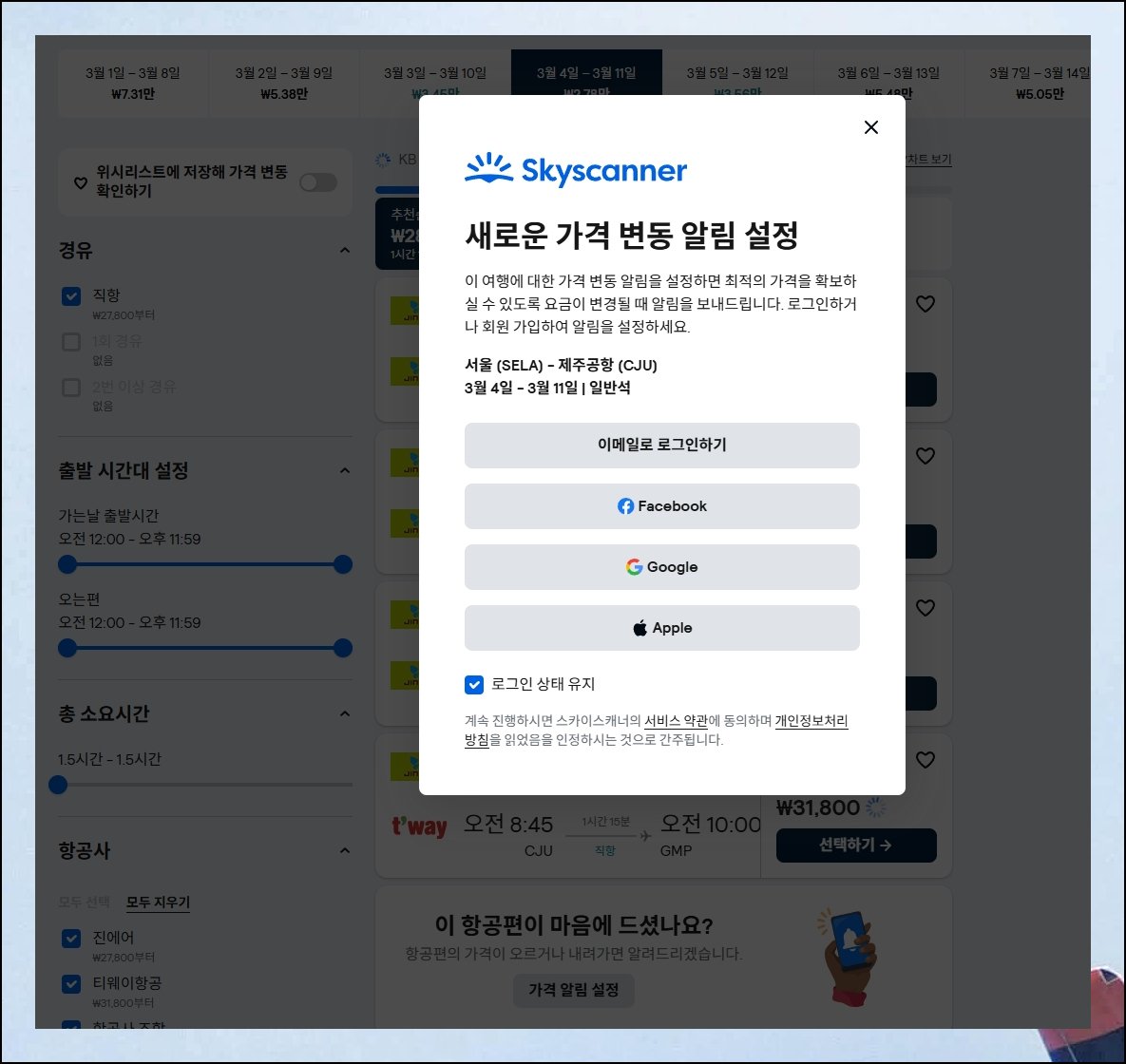 가격 변동 추적 서비스를 켜두면 제주행 비행기표가 더 싸졌을 때 메일로 소식을 받을 수 있어요. 바로 결제할 계획이 아니어도 설정해두면 큰 도움이 됩니다.