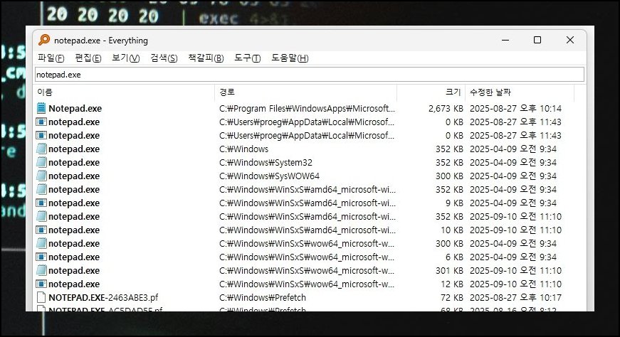 메모장 위치를 알고 싶을 때 EVERYTHING 입력란에 NOTEPAD만 쳐보세요. 운영체제 자체 탐색이라면 한참 돌아가겠지만 이 프로그램은 사정이 다릅니다. 키를 누르는 동시에 해당 항목이 곧바로 나열돼요. 레이아웃이 직관적이어서 처음 접하더라도 금방 조작법을 익힐 수 있습니다.