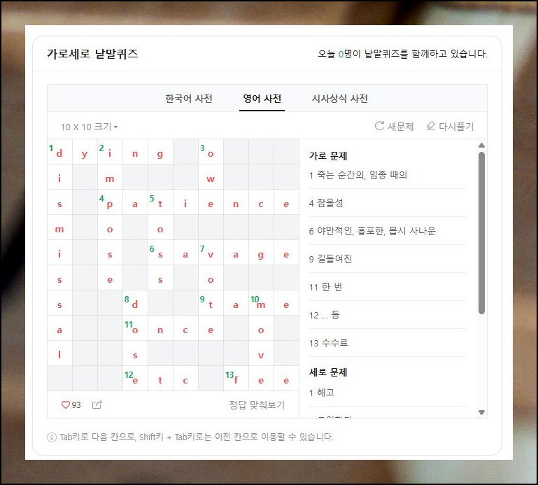 가로 세로 칸을 모두 채웠다면 정답 맞춰보기를 눌러 결과를 살펴보세요. 획득한 점수와 올바른 답이 화면에 즉시 나타납니다. 이 과정을 꾸준히 반복하면 어휘력이 부쩍 늘어나는 걸 체감하게 돼요.