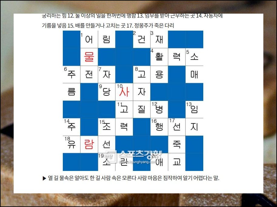 다음으로 권하고 싶은 곳은 스포츠경향에서 운영하는 가로 세로 단어 맞추기 코너입니다. 포털에 낱말퍼즐 스포츠경향을 입력하면 곧장 접근 가능해요.