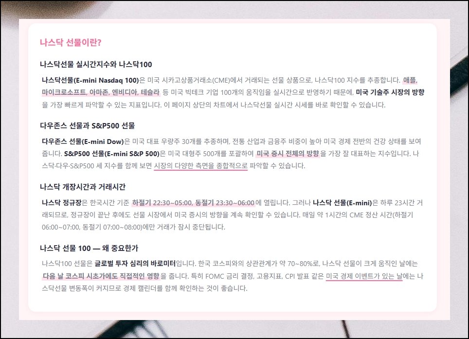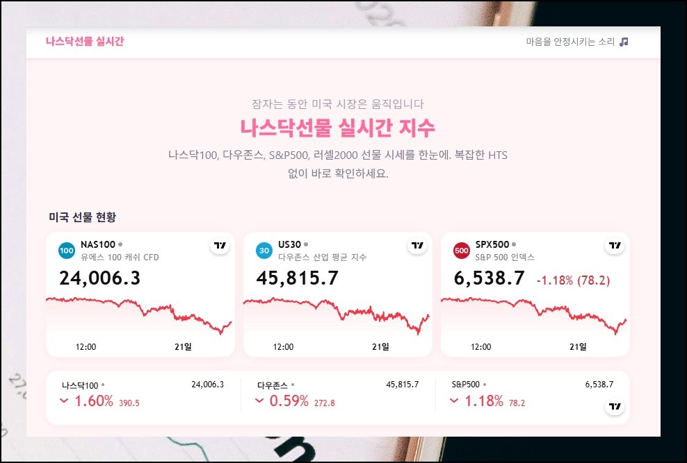 페이지를 열면 나스닥100, 다우존스, S&P500 같은 미국 대표 선물 수치가 한 화면에 잘 정돈되어 있어요. 현재 값뿐 아니라 상승폭과 하락폭이 실시간으로 갱신됩니다. 전용 트레이딩 툴 없이도 장세 온도를 재빠르게 감지 가능하다는 점이 편리해요. 새벽에 잠든 사이에도 거래는 멈추지 않으니, 기상 직후 다우지수를 훑어보는 습관을 권합니다.