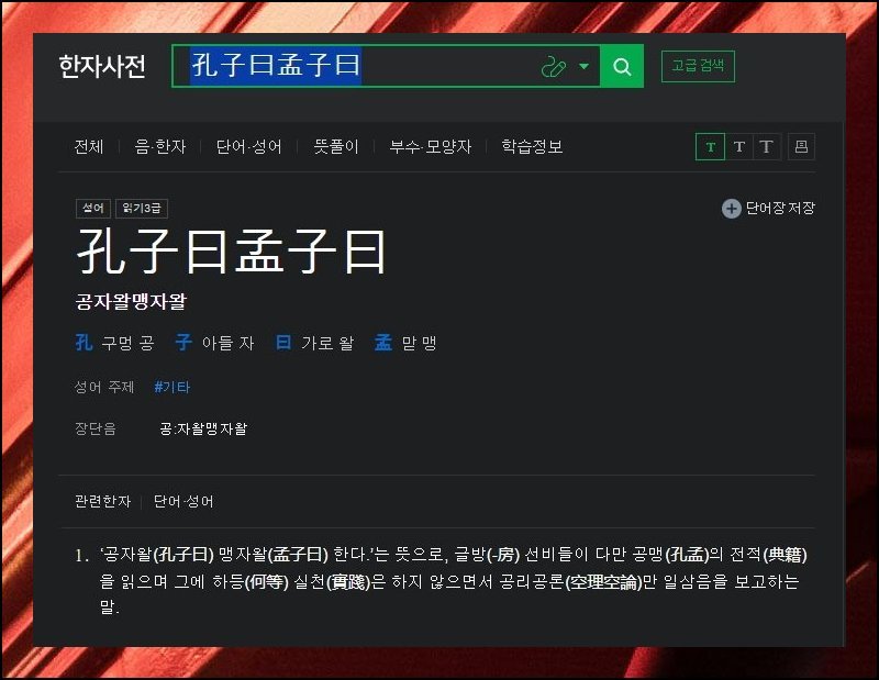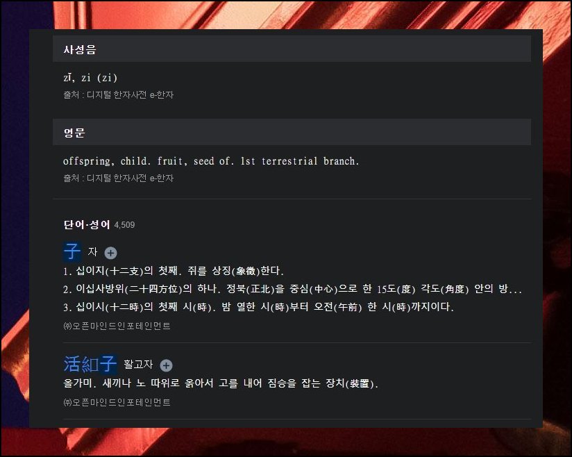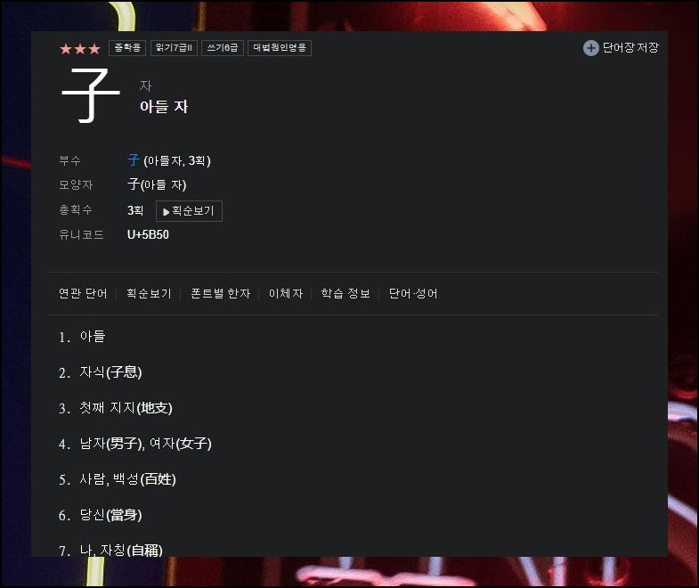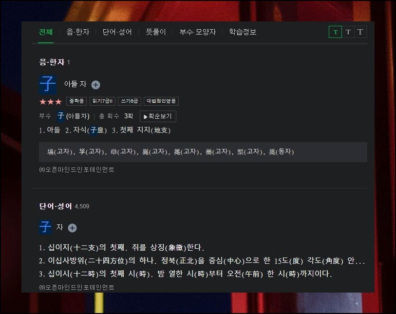 무료한문 번역기에서는 사성 발음 표기와 로마자 변환 정보까지 제공하고 있어요. 파생 표현과 고사성어 역시 남김없이 탐색 가능합니다. 아들 자 한 글자에서 뻗어 나오는 조합만 셀 수 없이 많죠. 무료한문 도구 가운데 데이터 규모가 가장 압도적인 곳이에요.
