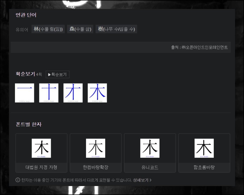 조회할 한자를 칸에 넣고 버튼을 눌러보세요. 결과가 순식간에 펼쳐집니다. 단일 글자 정보만 나오는 게 아니에요. 해당 문자를 품은 어휘도 묶여서 함께 표시됩니다. 나무 목으로 찾기를 시도해 봤는데요. 관련 표현이 천 건을 훌쩍 넘었습니다. 입력 한 번으로 얻는 데이터량이 상당하죠.
