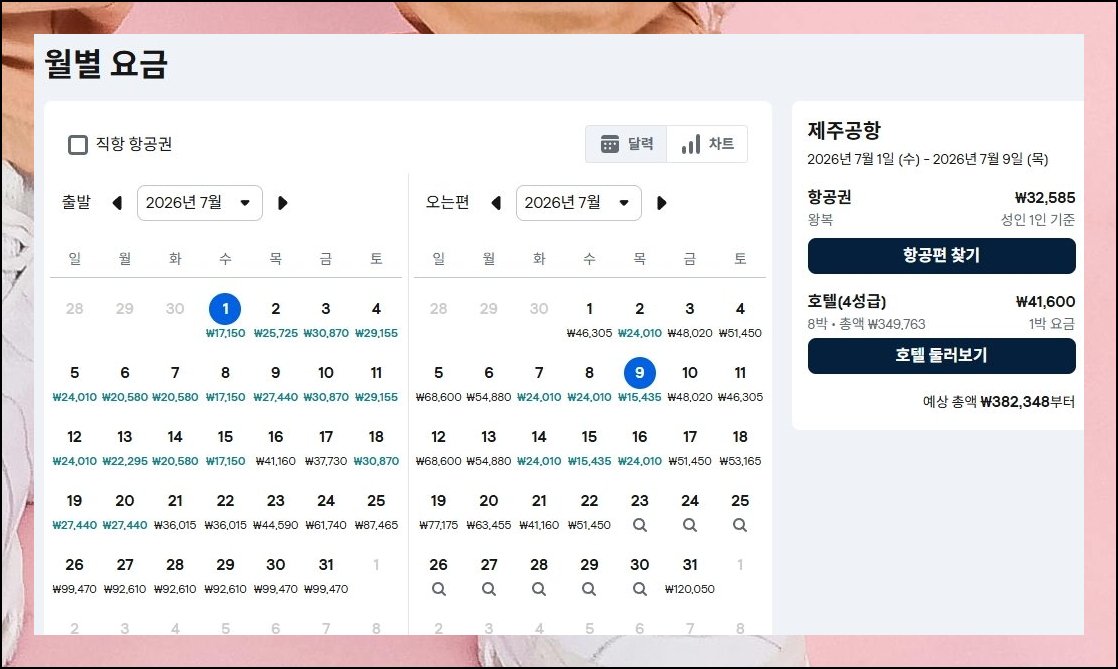 조회 버튼을 누르면 달력 모양의 가격비교 화면이 시원하게 펼쳐집니다. 실제로 2026년 7월 제주행 왕복 항공권을 검색해 살펴봤어요. 8일에 떠나 10일에 돌아오는 코스가 가장 부담 없는 편이었습니다. 이렇게 좋은 날짜를 잡은 뒤 항공편 찾기 메뉴를 클릭하시면 됩니다.