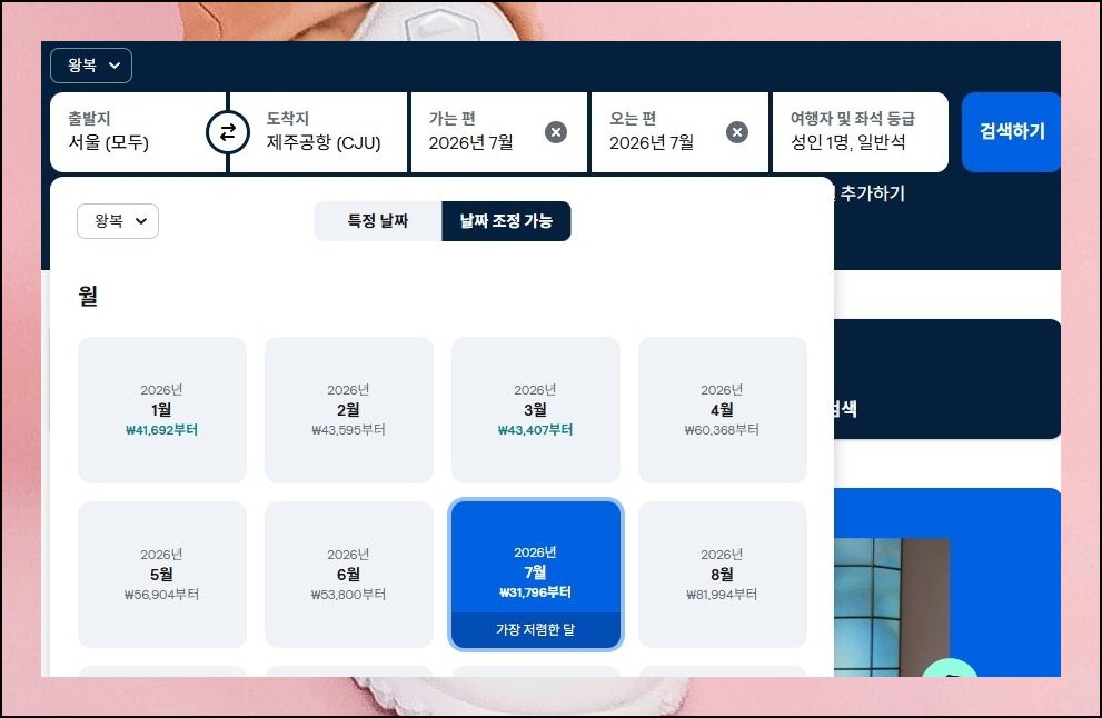 스카이스캐너 첫 화면을 열면 검색 박스가 즉시 눈에 들어와요. 도착 공항 칸에 제주공항을 적어 넣고 날짜 입력 영역으로 옮겨가세요. 이 대목에서 절대 빠뜨리지 말아야 할 요령이 하나 있습니다. 날짜 조정 가능 항목을 반드시 활성화해야 해요. 옵션 하나만 켜두면 한 달 치 최저 요금이 한 페이지에 일목요연하게 정리되거든요.