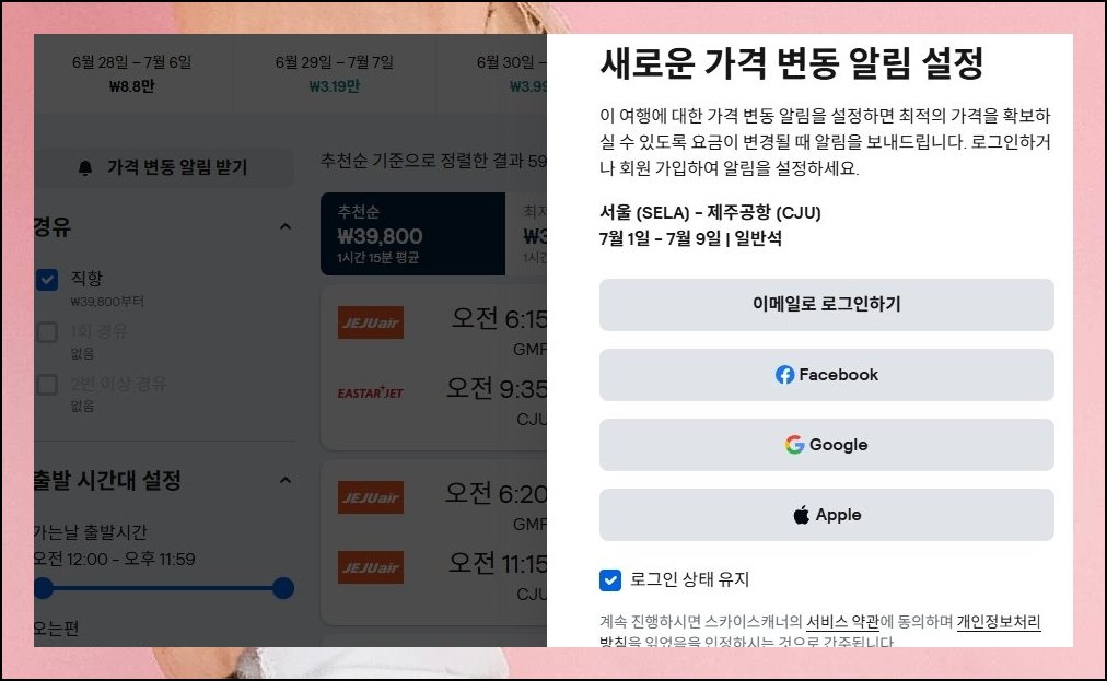온라인으로 제주 왕복 항공권을 알아보다 보면 같은 노선인데도 시시각각 요금이 출렁이는 장면을 자주 마주하게 돼요. 운임이 수요와 공급 균형에 맞춰 분 단위로 끊임없이 조정되기 때문입니다. 앞서 안내드린 가격비교 절차를 빠짐없이 진행했는데도 흡족한 금액을 못 만나셨다면, 스카이스캐너의 요금 변동 알림 받기 기능을 꼭 한번 써보시길 추천드려요.