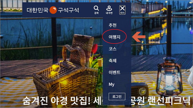 대한민국 구석구석 사이트에 접속했어요. 메뉴를 클릭한 후 여행지를 클릭해 주세요.