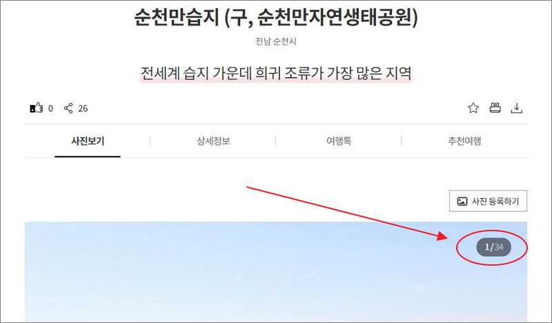 제가 좋아하는 여행지 한 곳을 선택해 보았어요. 순천만 습지인데요. 34장의 사진 보기는 기본이고, 여러 가지 여행 정보를 제공하고 있어요.