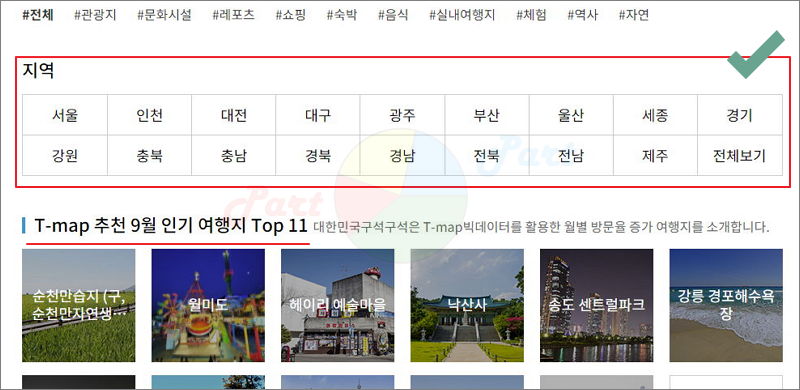 지역을 선택하는 부분 아래를 보면 티맵 추천 9월 인기 여행지 Top 11이 있는데요. 많은 사람들이 찾는 인기 관광 장소를 찾아보기 좋아요.