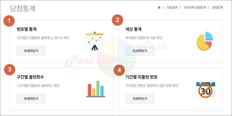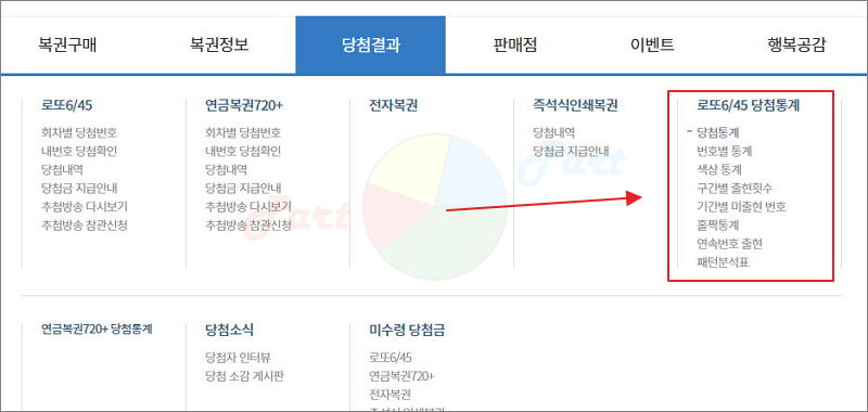 통계 자료를 이용하는 방법을 알려드릴게요. 메뉴에서 [당첨 결과]를 클릭해 보세요. 그럼 맨 우측에 있는 [로또6/45 당첨 통계] 카테고리를 찾을 수 있을 거에요. 거기에 보면 다양한 방식으로 된 통계 서비스가 마련되어 있어요.